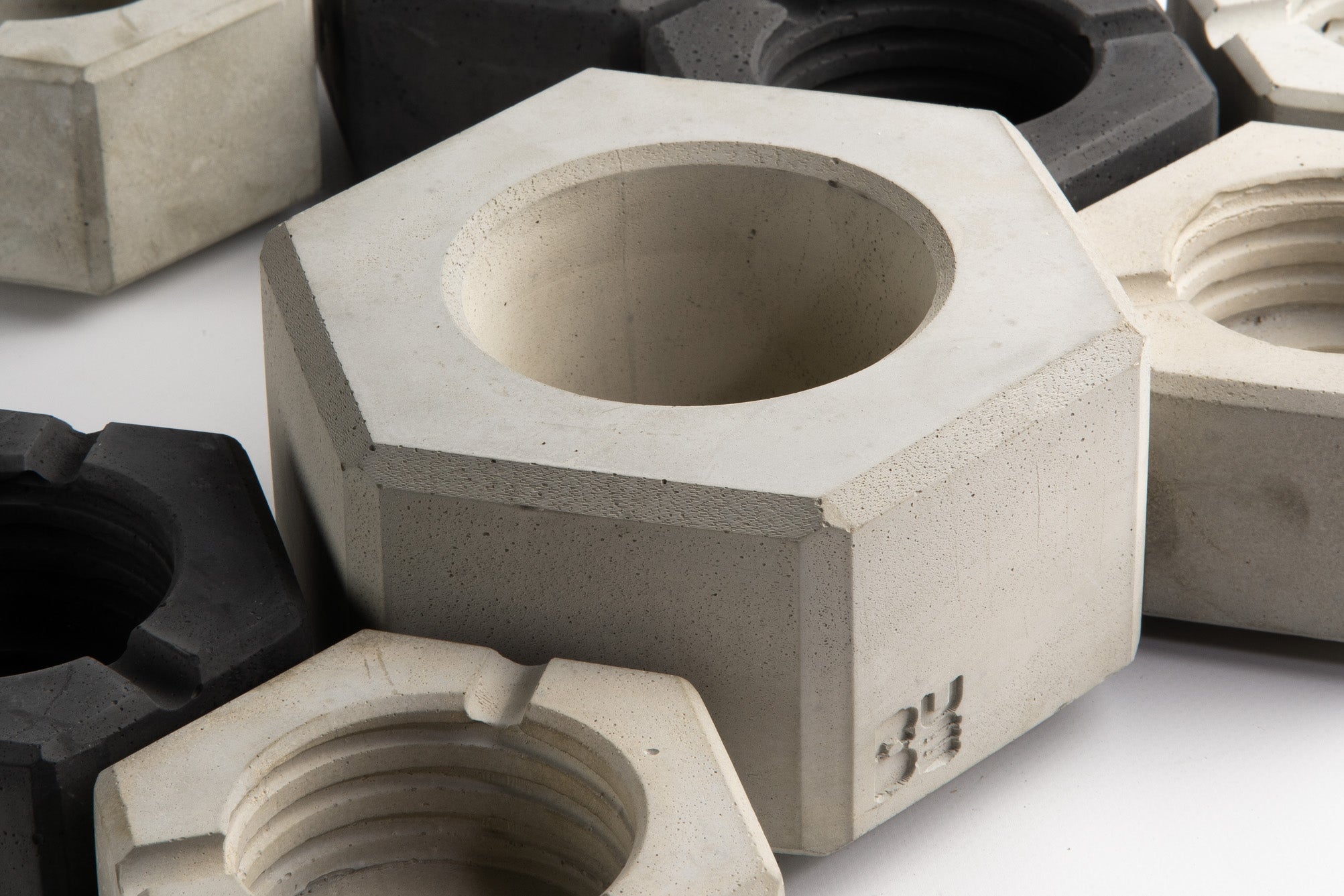 Questa serie di posacenere in cemento nasce dalla riduzione formale, dalla volontà di arrivare all’osso delle cose. Oggetti ispirati alle forme primarie della geometria – cilindri, cubi, prismi – e al linguaggio radicale dell’architettura brutalista: nudo cemento, masse compatte, angoli vivi.