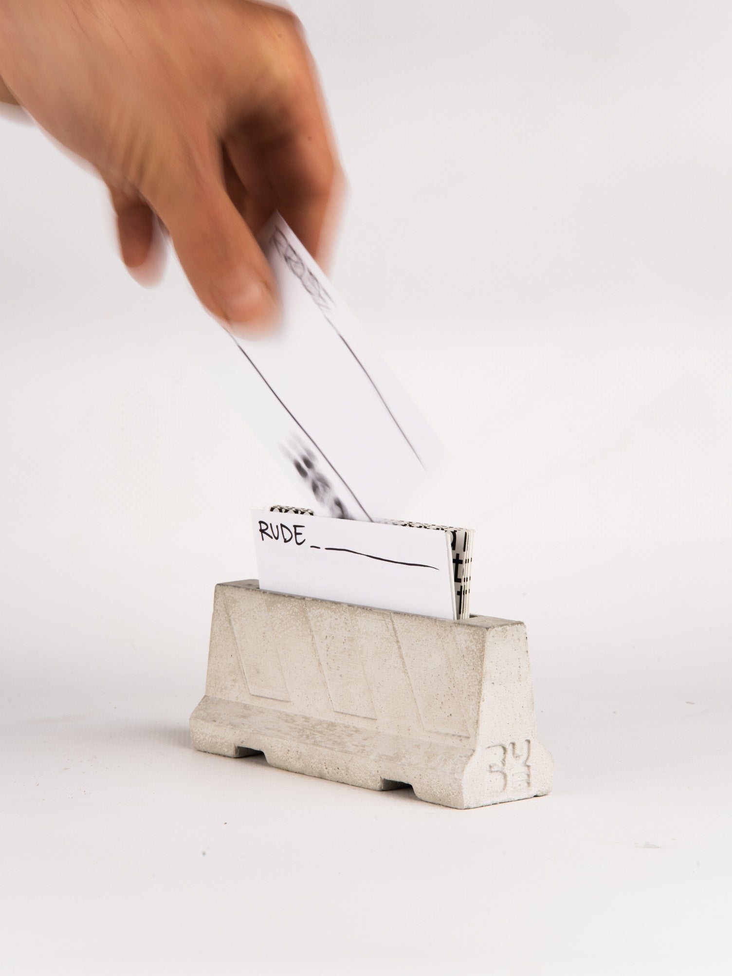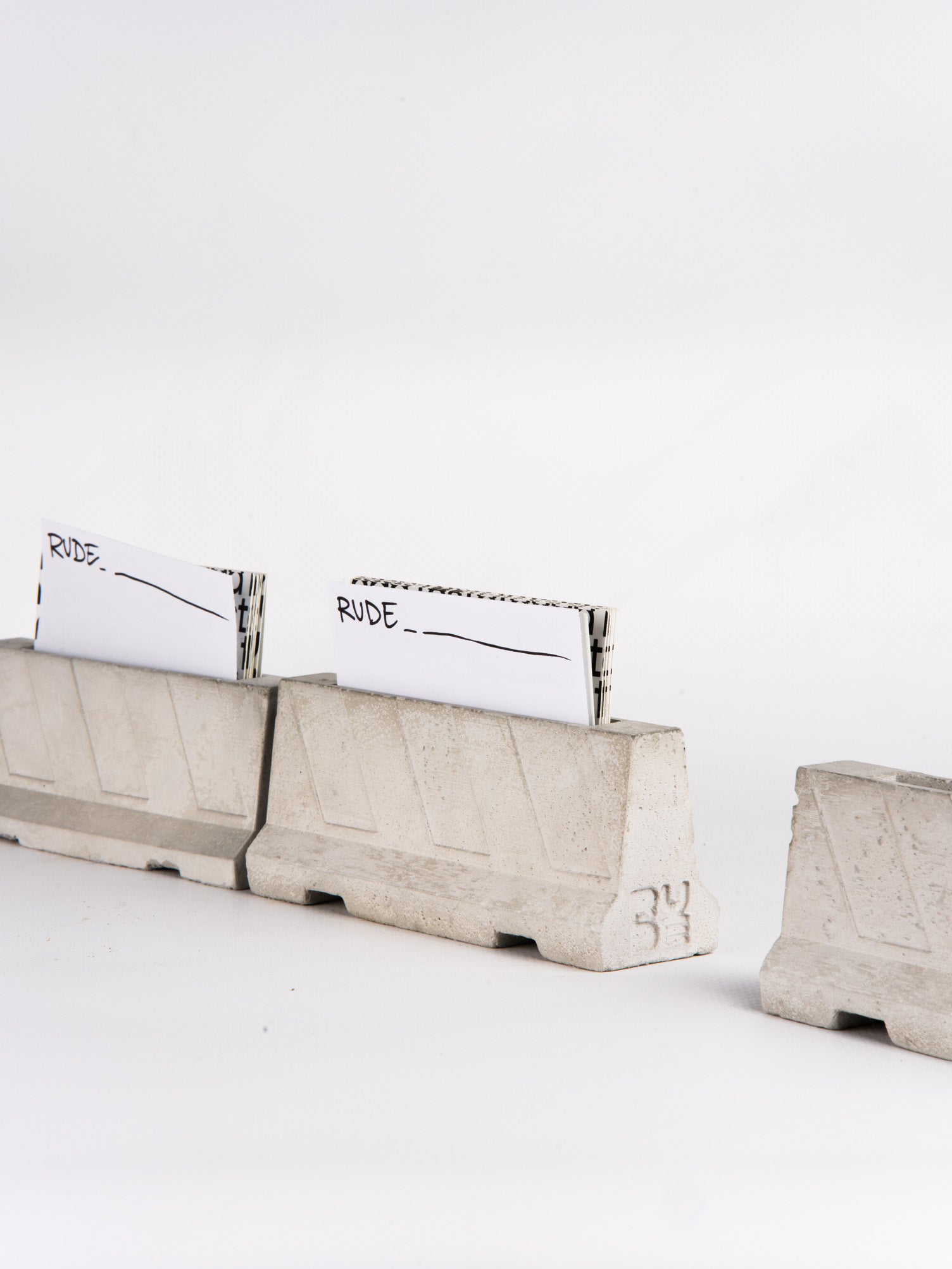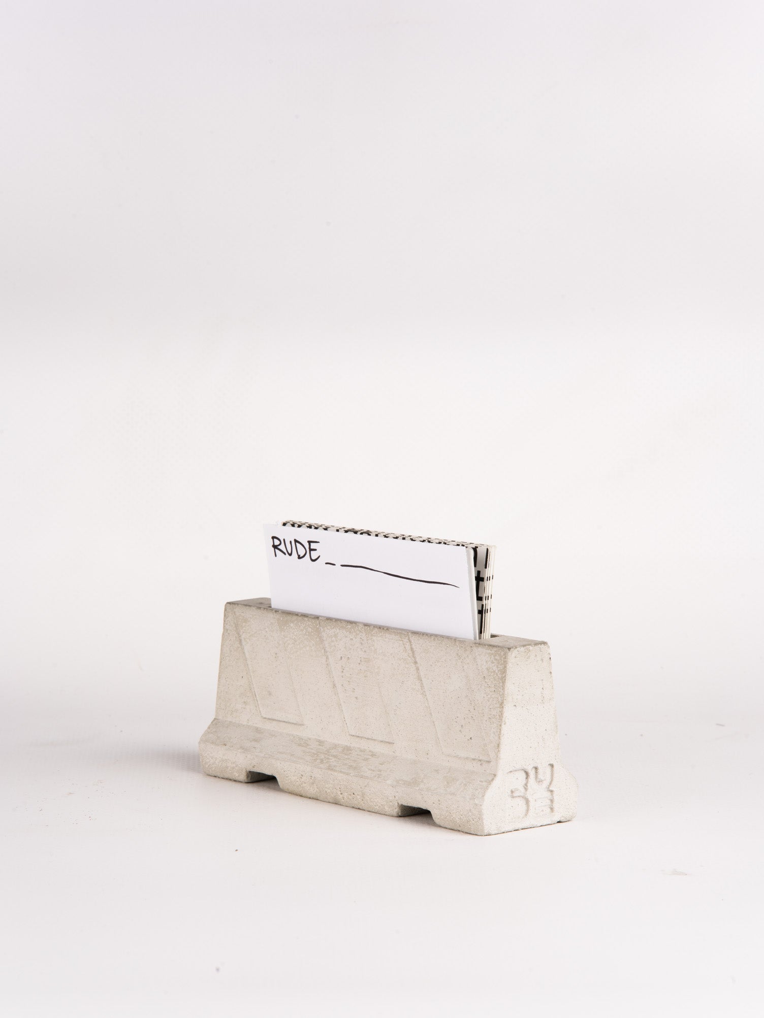 Fermacarte - porta biglietti da visita in cemento, ispirato alle barriere spartitraffico Jersey.