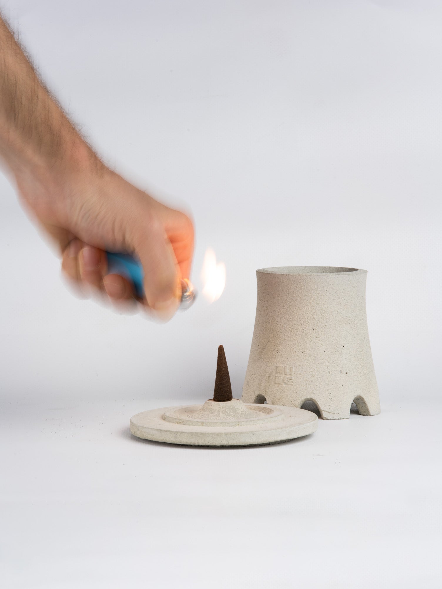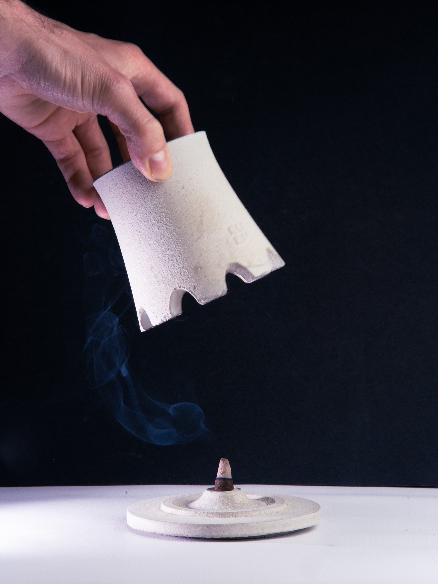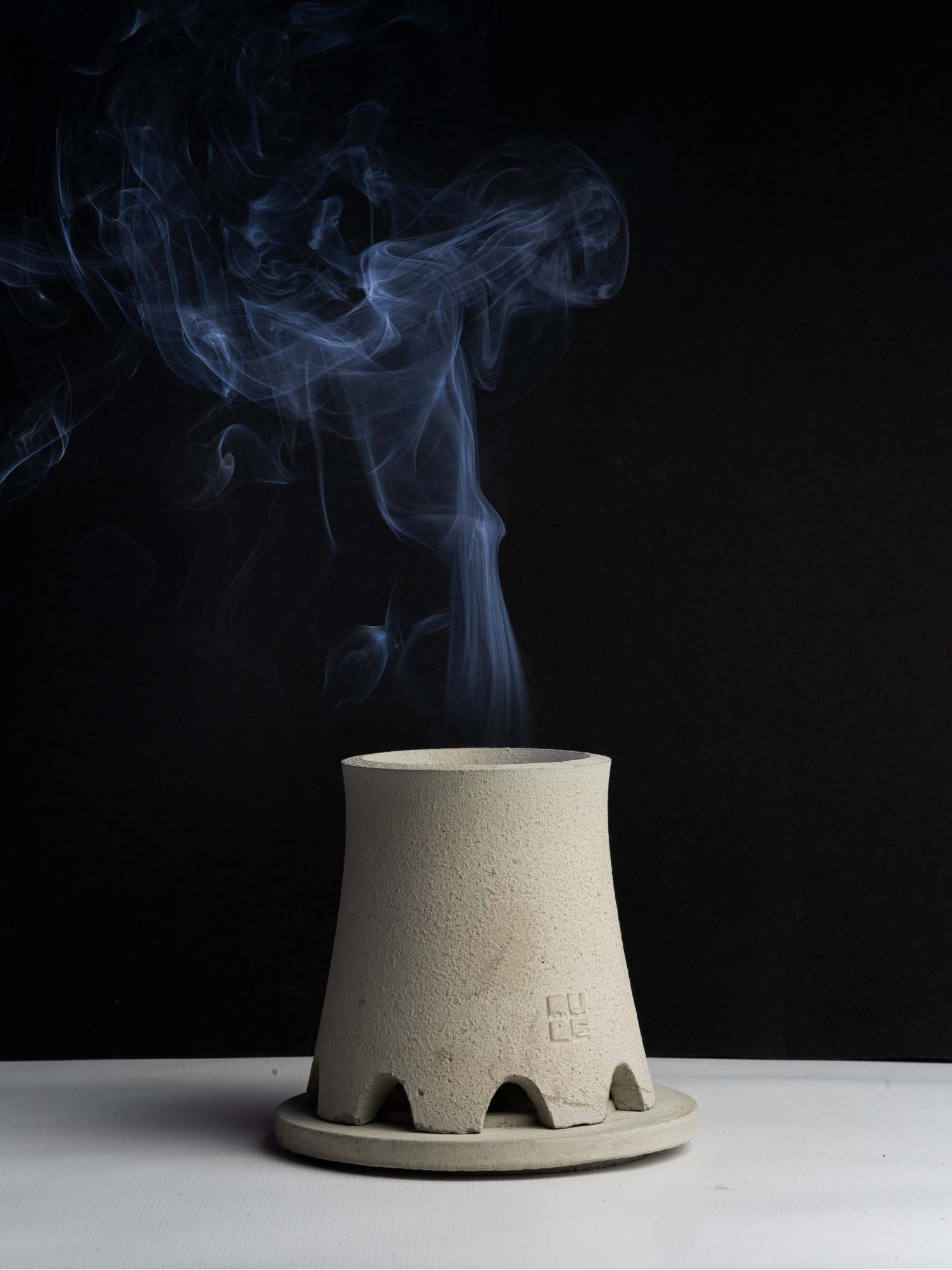 Portaincenso in cemento ispirato alle torri di raffreddamento delle centrali nucleari.